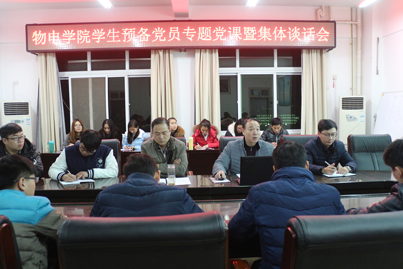 为增强学生党员党性意识,践行党的宗旨,发挥党员的先锋模范作用。12月12日,物电电子博彩导航 在理科楼911会议室召开学生预备党员专题党课暨集体谈话会。电子博彩导航 党委书记柳士刚、党委副书记李刚、党委秘书张康华及27名预备党员参加了会议。会议由党委副书记李刚主持。
