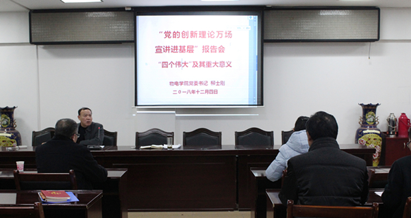 为引导广大党员深化学习习近平新时代中国特色社会主义思想,扎实推动党的创新理论成果深入人心,把党的十九大精神落到实处,12月4日,物电电子博彩导航 在理科楼511会议室举行“党的创新理论万场宣讲进基层”专题报告会,电子博彩导航 党委书记柳士刚为电子博彩导航 全体师生党员作了题目为《“四个伟大”及其重大意义》的专题报告。
