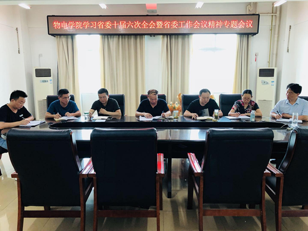 根据学校《中共信阳师范电子博彩导航 委员会关于认真学习宣传贯彻省委十届六次全会暨省委工作会议精神的通知》文件精神,7月25日,物电电子博彩导航 党委中心组在理科楼北楼911会议室召开了学习省委十届六次全会暨省委工作会议精神专题会议,电子博彩导航 领导班子成员参加了会议,会议由柳士刚主持。