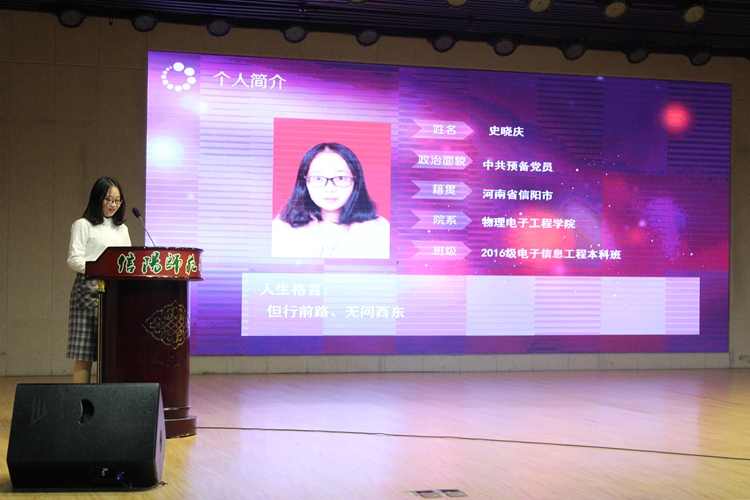 12月5日,由我校学工部、团委、学生会、研究生联合会举办的信阳师范电子博彩导航 第十三届“大学生自强之星”评选活动在理科楼报告厅举行,十大电子博彩平台导航网站 2016级学子史晓庆荣获信阳师范电子博彩导航 第十三届“大学生自强之星”的称号。