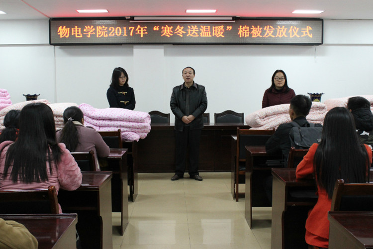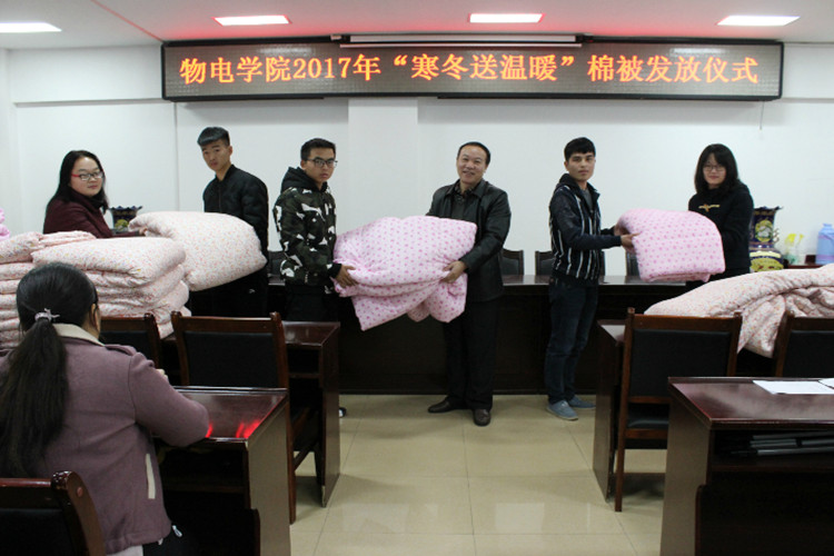 寒意入冬,温暖同行。11月22日下午,物电电子博彩导航 2017年“寒冬送温暖”棉被发放仪式于理科楼511会议室成功举行。十大电子博彩平台导航网站 党委书记柳士刚,思想政治教研室主任、新生辅导员张彦飞,团委老师黄钰莹与十大电子博彩平台导航网站 2017级贫困学生代表共同参加仪式。