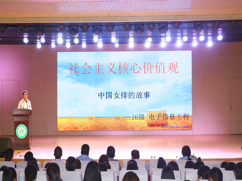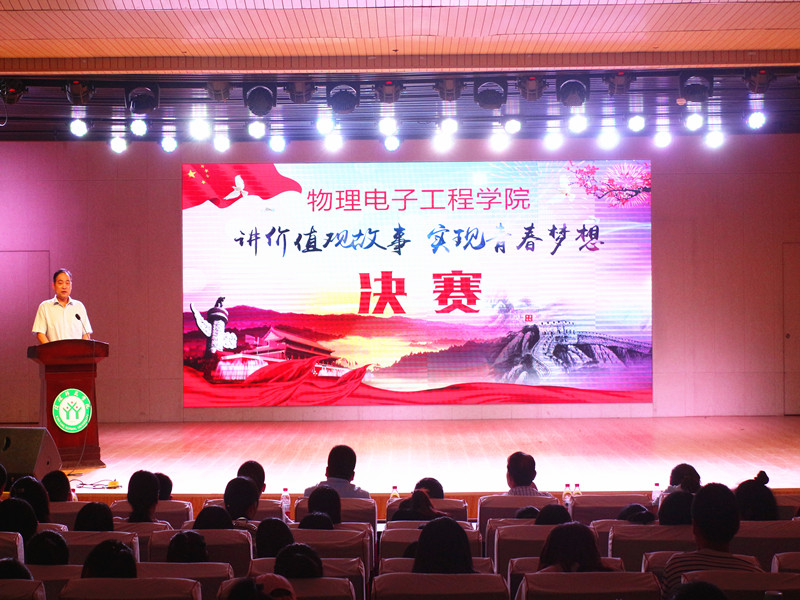 为大力推进社会主义核心价值观教育,培育和弘扬社会主义核心价值观,5月26日晚上,物电电子博彩导航 “讲价值观故事 实现青春梦想”主题教育活动决赛在理科楼多功能厅顺利开展。校党委宣传部理论科科长李东晓,校团委副书记邱洋,校学工部教育科科长李明,十大电子博彩平台导航网站 党委书记柳士刚,党委副书记李刚,副院长孙宜海,党委秘书张康华,思想政治教研室主任张彦飞,办公室主任周理海,辅导员黄钰莹等领导老师莅临现场担任比赛评委,与十大电子博彩平台导航网站 500余名学子共同观看比赛。