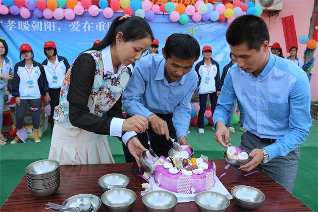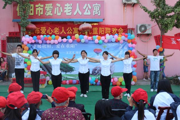 团总支书记刘华超献上的节日慰问祝福更是博得了老人们的阵阵掌声,最后,在伴乐独唱《夕阳红》中,信阳市共青团委志愿者工作部部长阮飞,青年志愿者协会副会长王相亚,团总支书记刘华超上台为老人们切蛋糕,老人们的欢笑声合着蛋糕的浓香中,汇演圆满结束。
