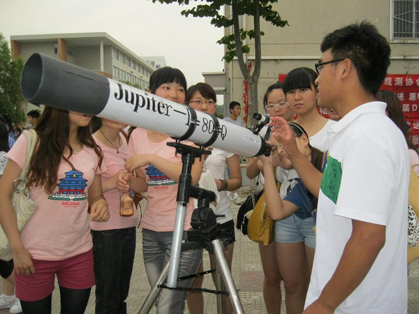晚上7点,活动尚未开始,许多天文爱好者相聚八餐广场,参与活动的同学们首先了解了望远镜的光学原理、基本参数的意义等,积极的与协会人员相互交流。观测活动正式开始后,天文观测协会的相关人员为同学们详细讲解了星座及与星座相关的传说故事,并耐心的解答了现场同学们提出的问题,解除了同学们天文学方面的疑惑。随后,同学们自己体验,观测星空,期间,协会负责人还为同学们介绍了相关仪器的由来及构造,其中的一台由该社团利用废旧铁管和木块自主制造的望远镜极为突显,得到了大家的一致赞叹。活动中,随机有奖问答环节,吸引了众多过往行人的热情参与,现场气氛活跃,热闹非凡。