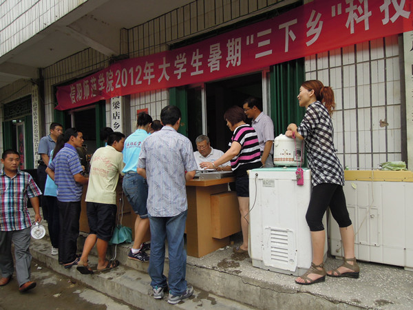一到达目的地,服务团成员们就迅速行动起来,搬桌子、挂条幅、试音响,搭建起了服务站点,吸引了众多过往群众驻足咨询。不一会儿,村民们纷纷从家里搬来了各类需要修理的家用电器。没多久,家电维修服务处便被电器们“包围”了,电视机、电磁炉、电风扇、洗衣机等摆满了服务站点,“生意”非常红火。成员们有条不紊,忙而不乱,认真地将需要维修的家电进行一一登记,耐心询问相关故障,并做好详细记录。维修人员坚持定点维修和上门服务相结合,仔细检查各个电器零件,大到电视机、洗衣机,小到收音机、计算器,认真找出损坏原因,尽力解决好每个问题。他们一天工作至少八个小时,有时还要挤出吃饭时间或熬夜对家电进行及时维修。在维修过程中,成员们对当地居民提出的一些疑问进行耐心解答,并分发正确使用电器和家用电器日常保养的宣传单。