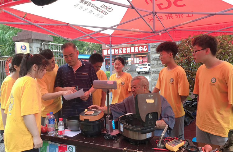 在疫情防控常态化的形势下,电子博彩导航 按照学校“三下乡”暑期社会实践工作通知要求,以“学党史悟思想 我为群众办实事”为主题,组建大学生社会实践服务队于2021年7月5日至7日走进信阳市浉河区金牛山街飨堂社区开展义务家电维修、电力安全进家庭科普宣传等服务活动。