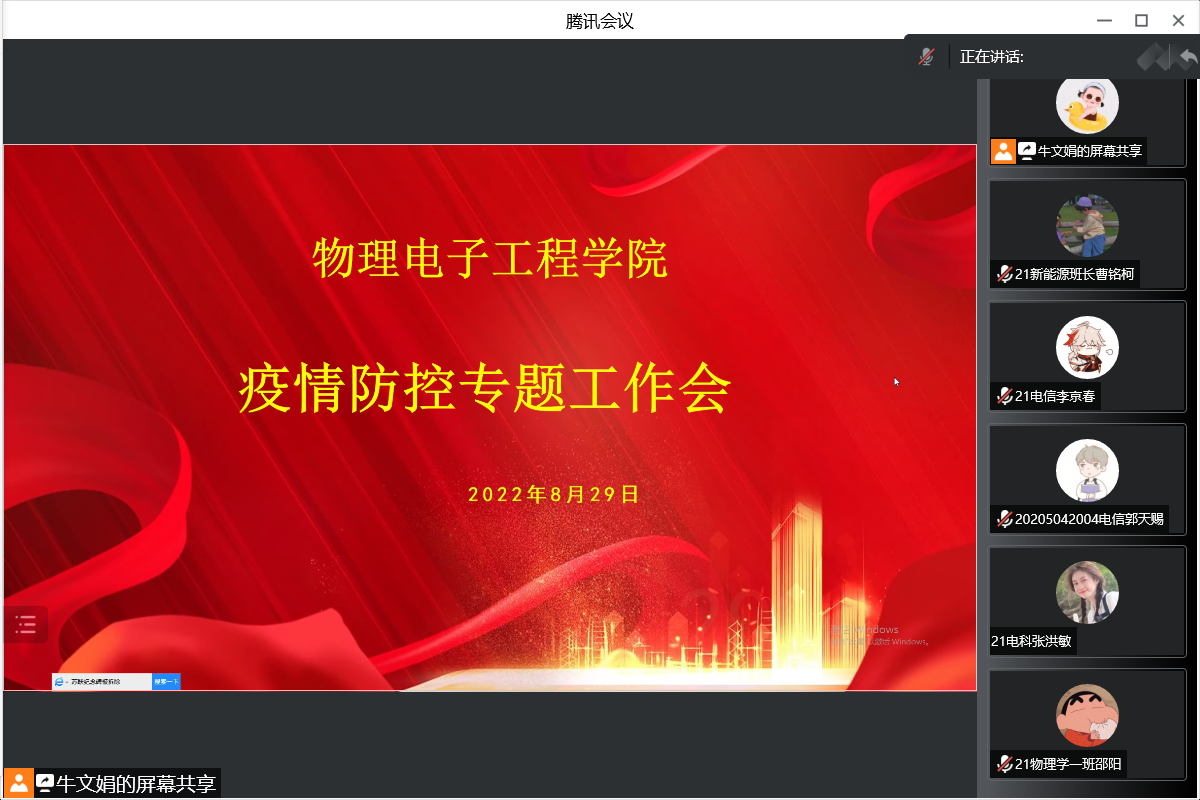 召开疫情防控专题会。根据《信阳师范电子博彩导航 2022年秋季学期开学工作方案》,结合十大电子博彩平台导航网站 实际情况,十大电子博彩平台导航网站 于8月29日召开疫情防控线上专题工作会,学生会干部、各班班长参会。会上,团委老师牛文娟向同学们传达并解读了《信阳师范电子博彩导航 2022年秋季学期本专科学生返校报到须知》,党委副书记张丽就如何做好学生开学返校的疫情防控工作进行安排部署,确保学生能够顺利、平安返校。