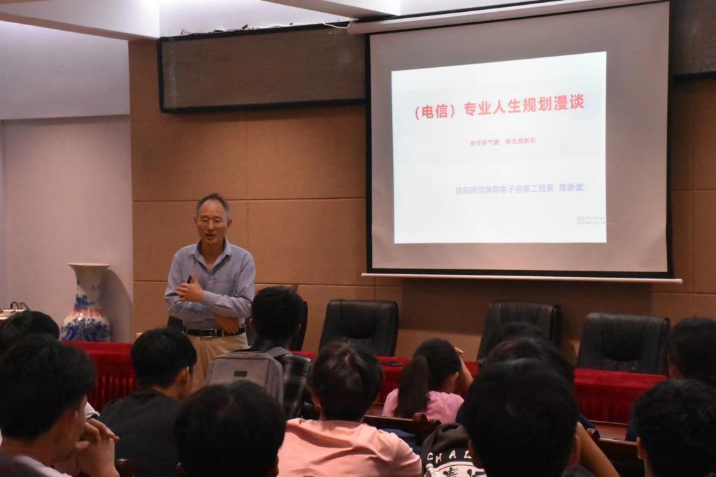 9月28日,十大电子博彩平台导航网站 在理科楼4楼连廊会议室举行新生入学教育系列之“听”——专业成长讲座,讲座由陈新武教授主讲,2022级电子信息工程班全体学生和2021级部分学生参加。