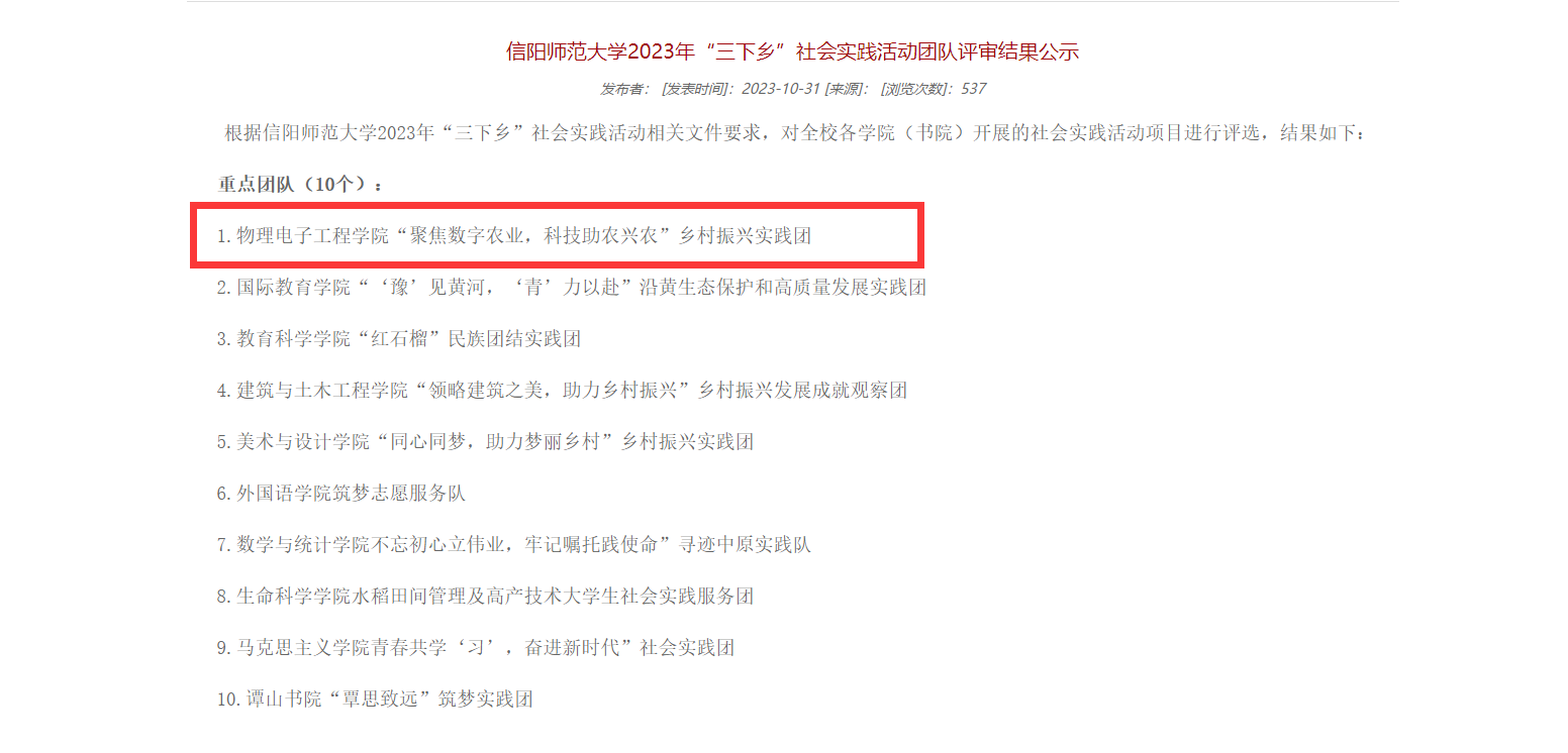 近日,信阳师范大学2023年“三下乡”社会实践活动评审会公布评审结果,十大电子博彩平台导航网站 的“聚焦数字农业,科技助农兴农”乡村振兴实践团被评为重点团队。