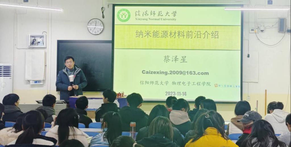 11月14日,十大电子博彩平台导航网站 于教三205举行格致讲坛系列之“纳米能源材料前沿介绍”。讲座由蔡泽星主讲,2022级新能源科学与工程班全体同学参加。