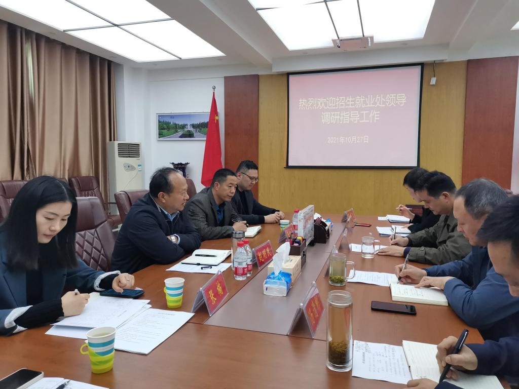 10月27日下午,招生就业处处长赵明民、副处长王松亭、张楠等一行到十大电子博彩平台导航网站 调研指导招生与就业、创业工作,电子博彩导航 党委书记刘百超、院长涂友超、党委副书记张丽、副院长汤清彬及相关工作人员参加会议。