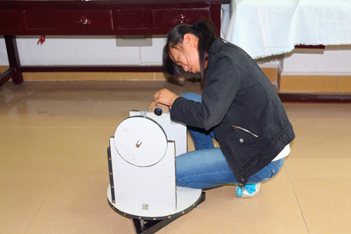 自2012年赤道仪制作项目立项后,该小组成员按各自的分工,利用课余时间积极学习了相关的知识;调查相关材料价格,找出了性价比最佳的材料;充分整合身边一切可利用的如废弃木料、泡沫等资源,达到了既将物品二次利用,又减少开支的目的。该小组成员在参与制作的过程中,利用锯条及砂纸等工具对部分木料进行了切割与打磨,利用螺丝刀等工具对部分木料进行了钻孔处理,最终成功制作完成了组装赤道仪所需的零部件。这些零部件主要包括高强度压缩木板旋转圆盘,支撑臂,轴承中转轴,钢结构三脚支撑架等。其中轴承中转轴承力强,花费了较多时间制作完成;水平固定部件利用螺母完成,使得该部分结构简单,操作方便;支撑部分利用了钢结构的三角支撑架承载力强,稳定力高的特点进行制作;木盘仰角固定部件的设计在方便操作的同时节约了制作成本。在所有零件均已制作完成后,心灵手巧的项目组成员共同组装好了该赤道仪。