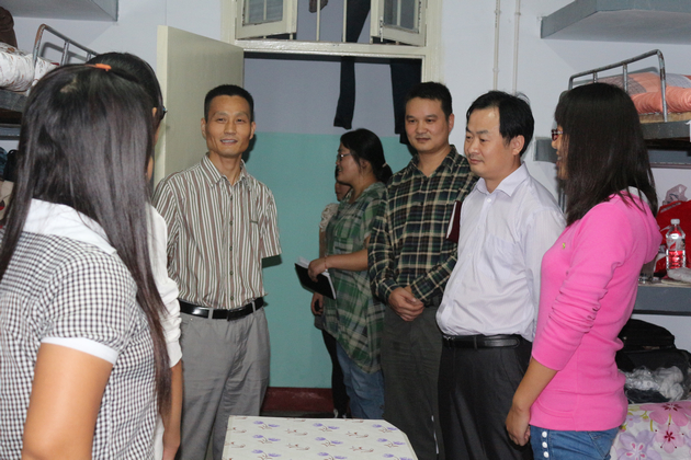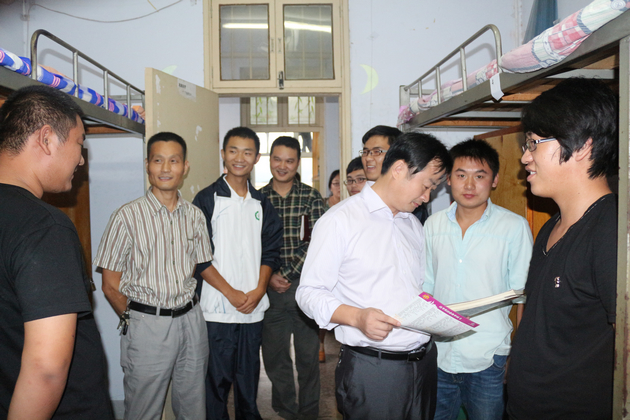 9月9日下午5点,迎着细雨,十大电子博彩平台导航网站 党总支书记苗天峰、院长罗永松、党总支副书记刘百超,带领团总支办公室所有成员深入学生宿舍,走访慰问2013级新生 。