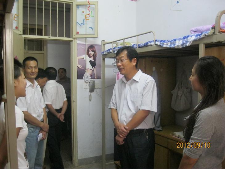 余作斌、郜火星一行深入14#学生公寓,每到一间宿舍,校领导都仔细了解学生所学专业,亲切询问新生 “对学校的安排满意不满意、适应不适应?”,“在生活上有没有什么困难?”、“想不想家?”……一句句亲切的问候,拉近了师生间的距离。他们还仔细叮嘱新生要注意安全,遵守学校相关规定,尽快适应大学生活。同时,对于新生特别提到的军训一事,校领导希望他们要做好思想准备,发扬不怕苦不怕累的精神,磨练意志,坚持到底。