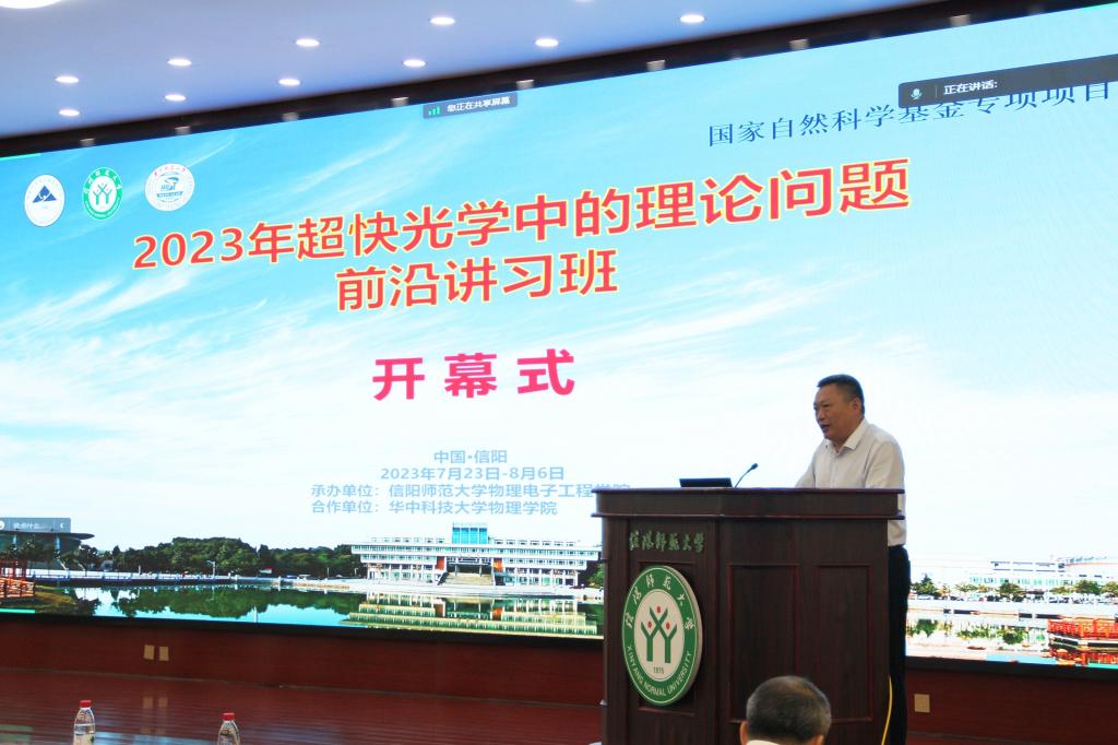 7月24日,由十大电子博彩平台导航网站 承办、华中科技大学物理电子博彩导航 协办的“2023年超快光学中的理论问题前沿讲习班”隆重开班。来自北京大学、中国科学技术大学、华中科技大学、中山大学、国防科技大学、中南大学、吉林大学、哈尔滨工业大学、兰州大学、华东师范大学、中国工程物理研究院研究生院、中国科电子博彩导航 物理研究所、中国科电子博彩导航 西安光学精密机械研究所等数十所高校和科研院所的100余位专家学者和博士、硕士研究生参加本次讲习班。信阳师范大学副校长井强山教授出席开班仪式并致欢迎辞。讲习班开班仪式由我校科学技术处处长、电子博彩导航 院长涂友超教授主持。