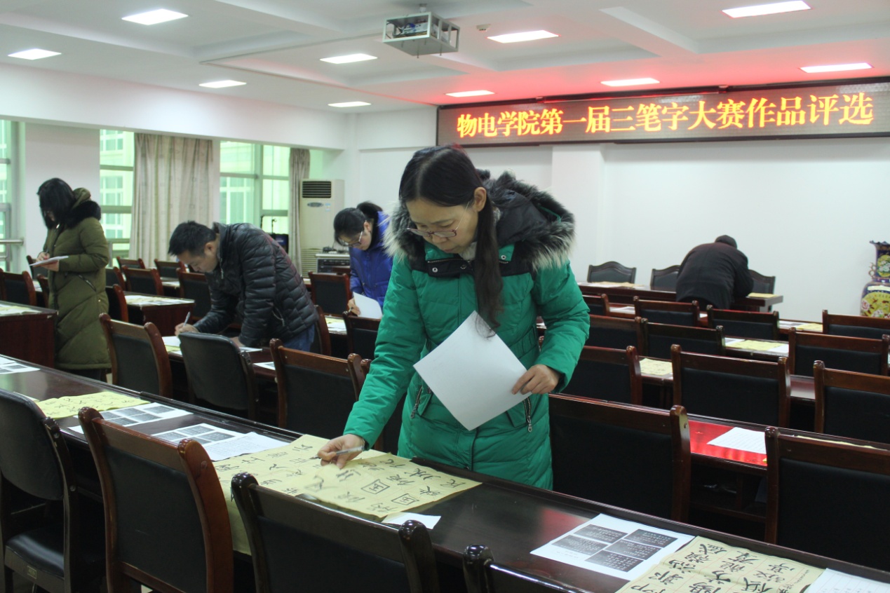 12月17日下午,十大电子博彩平台导航网站 于理科楼连廊会议室开展“三笔字”作品复评活动,物电电子博彩导航 本科教学指导与管理委员会、分团委老师和学生代表等10位同志担任本次大赛的评委。大赛共收到参赛作品230余件,经初赛遴选出了50套获奖作品。复赛现场,评委们重点从“三笔字”的间架结构、章法布局、规范和美观等方面进行综合评审,经过激烈角逐,共评选出一等奖5名,二等奖10名,三等奖15名,优秀奖20名。获奖作品在物电电子博彩导航 办公区展出,并在学校教师教育文化节中参加相关赛事的角逐。