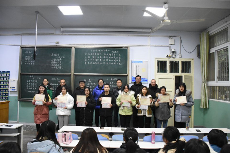 随后,十大电子博彩平台导航网站 于教二梯一教室进行了获奖选手粉笔字展示和颁奖。在粉笔字展示环节中,一、二等奖获得者顺序上台在黑板上书写随机抽取的诗歌内容,学子们全神贯注、精心排版、行云流水、一气呵成,凭借端庄娟秀、整齐大方的字体向在场观众展现了中华汉字的独特魅力,赢得评委和观众的一致好评。最后,大赛评委老师为获奖人员颁发证书、奖品并合影留念。
