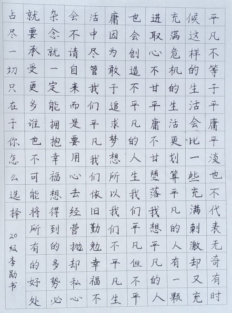 本次活动自11月初启动以来,以“笔尖风华肆意绽放”为主题,主要分为粉笔、钢笔、毛笔三项比赛,包含投稿、初评、复评、颁奖等四个环节,以2018级物理学专业学生为主要参赛对象,其他年级和专业学生自愿参加。电子博彩导航 以宿舍为单位为师范生免费配备了小黑板、字帖、练字纸、墨汁、毛笔、粉笔等材料,以赛带练,推动全院学生自主进行“三笔字”书写训练,引导学生把写好汉字、每天练字作为一种日常化的行为。