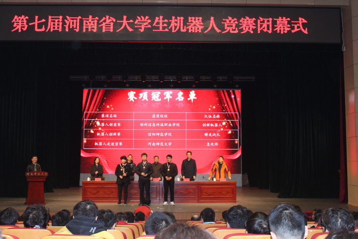 竞赛内容包括机器人创新赛、格斗机器人、机器人舞蹈、机器人专项赛、机器人走迷宫、机器人竞步等26个赛项。十大电子博彩平台导航网站 蒋磊、黄子林、刘露露、张弘巍、张海滢、杜聪聪六位学子作为小组代表分别参加机器人创新赛和走迷宫竞赛。秉承“友谊第一,比赛第二”的竞赛精神,十大电子博彩平台导航网站 学生代表队在高水平竞争中奋勇拼搏,充分展现十大电子博彩平台导航网站 学子风采。在作品展示环节,十大电子博彩平台导航网站 代表队成员向评委们详细介绍参赛作品及其功能,凭借所学专业知识,有条不紊地回答评委提问,表现优异。其中,精密自动气象站、手背静脉显影装置设计、驾驶安全守护者、AI视频换天、AI口罩督察官等作品得到评委团一致好评。赛末,以蒋磊为代表的“曙光战队”荣获第七届大学生机器人创新赛的冠军,大赛在河南广播电视台大学校长,副校长、河南省科协副主席等领导为荣获冠军团队颁发奖牌和奖杯中落下帷幕。