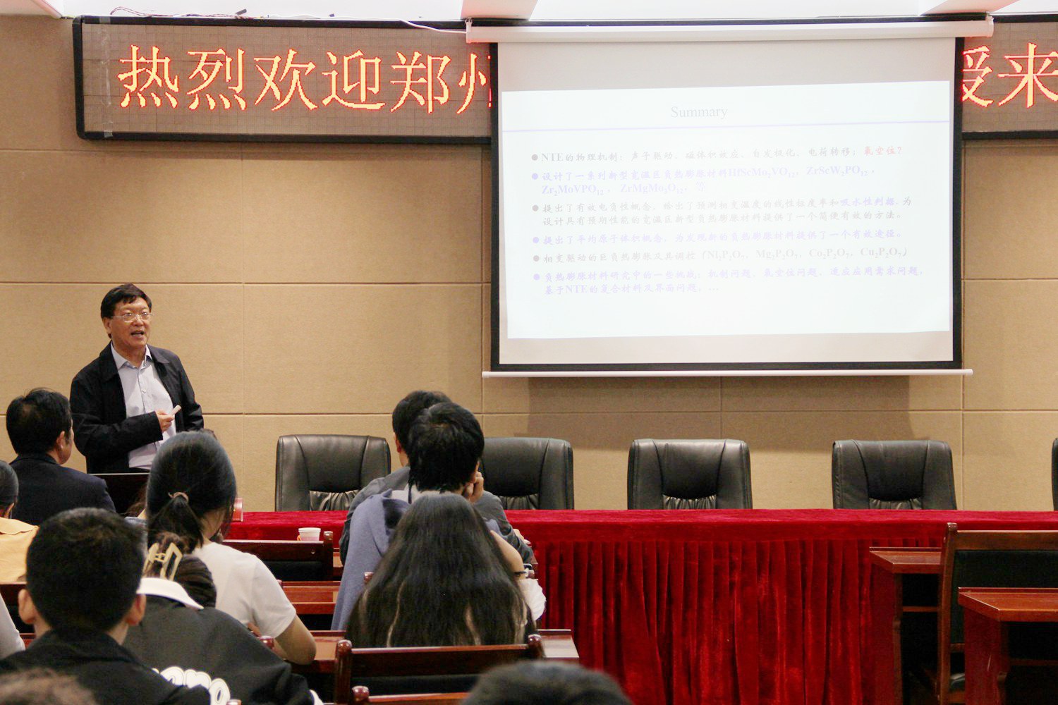 5月12日,应电子博彩导航 邀请,郑州大学梁二军教授来十大电子博彩平台导航网站 讲学,在理科楼会议室作了题为“负热膨胀材料研究现状、挑战与机遇”的学术报告。电子博彩导航 教师、研究生及本科生聆听了报告。报告会由副院长龚克主持。