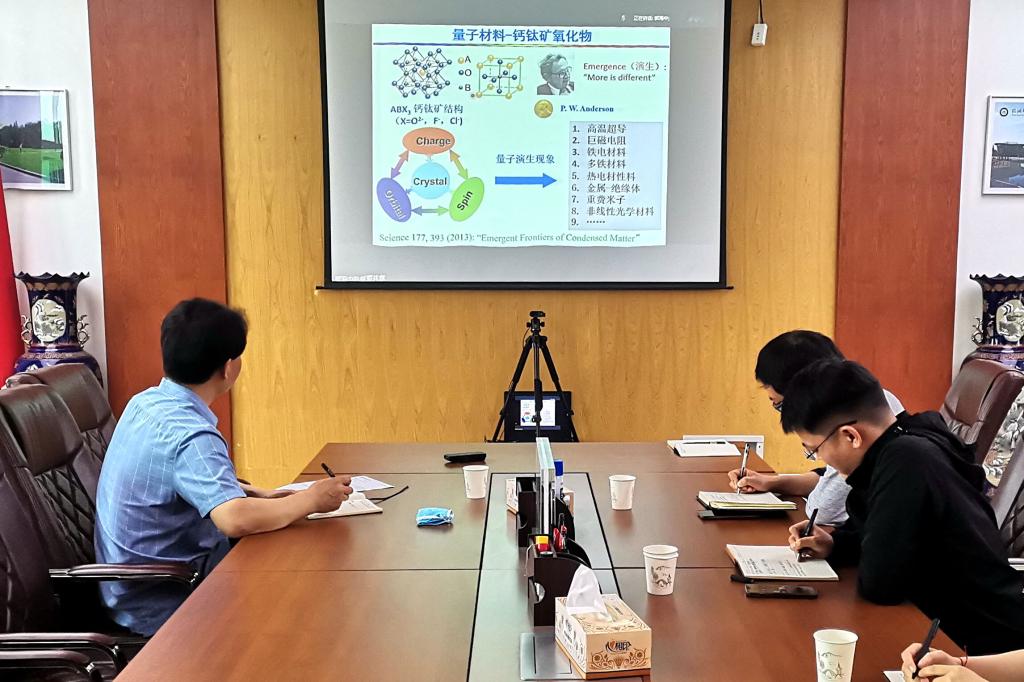 郭海中首先介绍了低维量子材料的研究背景和现状,随后讲解了团队利用应力、电场、光场等外场对钙钛矿氧化物薄膜物性调控的最新科研成果,展示了低维量子材料在外场激励下呈现出的新奇量子态和物理效应。报告结束后,郭海中同与会人员就相关研究内容进行了讨论,并详细回答了师生的提问。