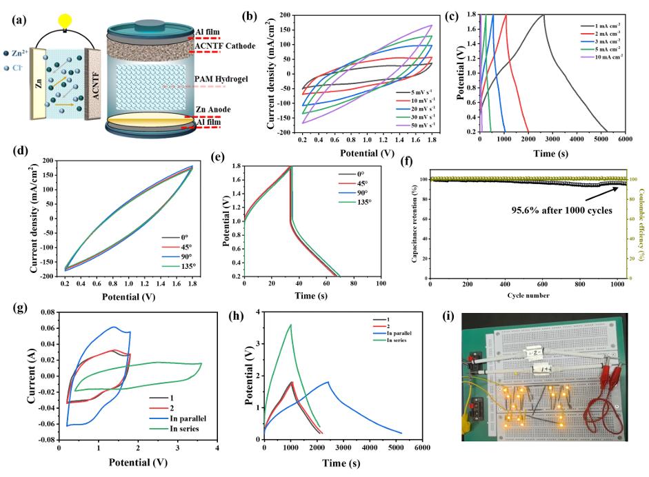 论文主要报道了空气活化对碳纳米管泡沫表面含氧官能团的精确调控,协同优化碳纳米管孔隙结构、比表面积和亲水性,使碳纳米管电导率和电化学活性达到平衡,实现锌离子混合电容器性能的优化。组装的器件在1 mA cm-2电流密度下具有1644 mF cm-2的容量,且在20 mA cm-2的大电流密度下容量保持率为83.3%。